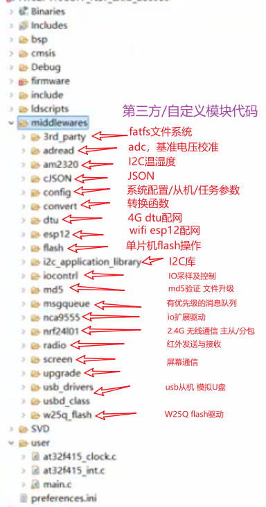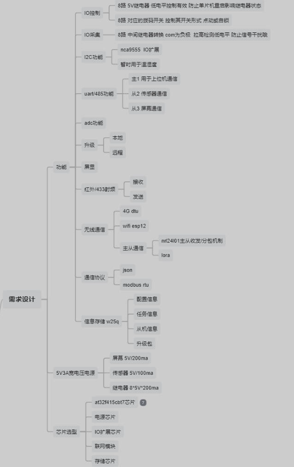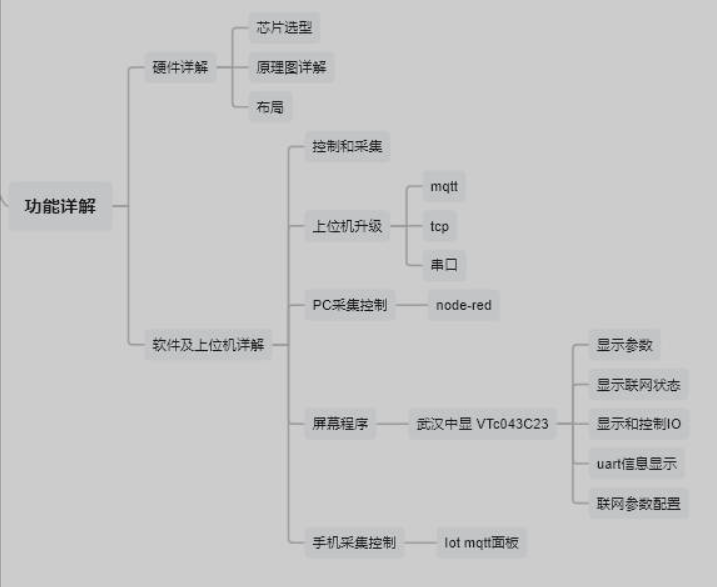 json/modbus的采集控制指令,node-red的配置及控制采样方式,手机app(Iotmqtt面板)的配置及控制采样方式,ADC采样(可分压),串口屏的通信,红外解码和发送,信息转发,u盘模式修改系统参数,上位机的升级流程等。